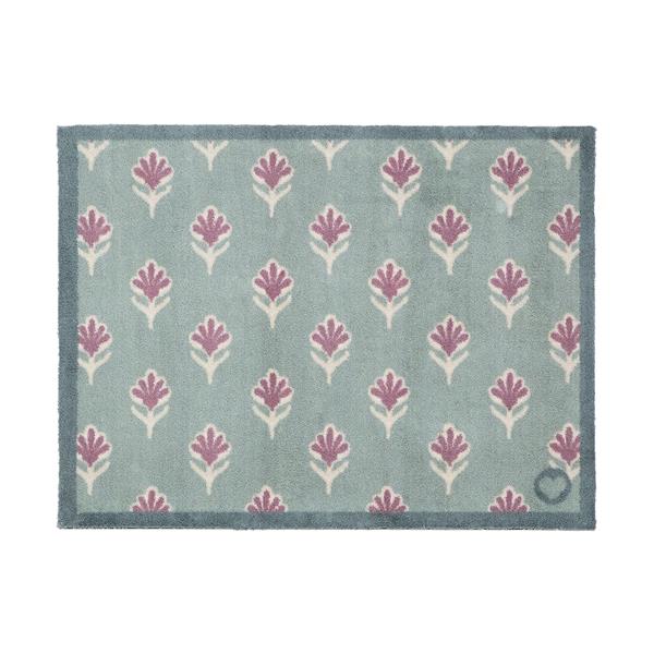 Stop dirt in its tracks with this simple floral design. Set against a green background with darker green border this design consists of a woodblock style pattern of small purple flowers