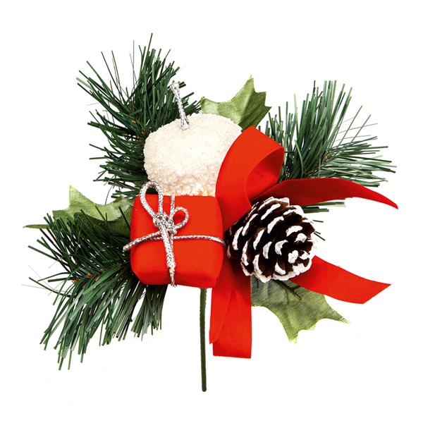 Red and white apple and parcel pick with frosted pine cone