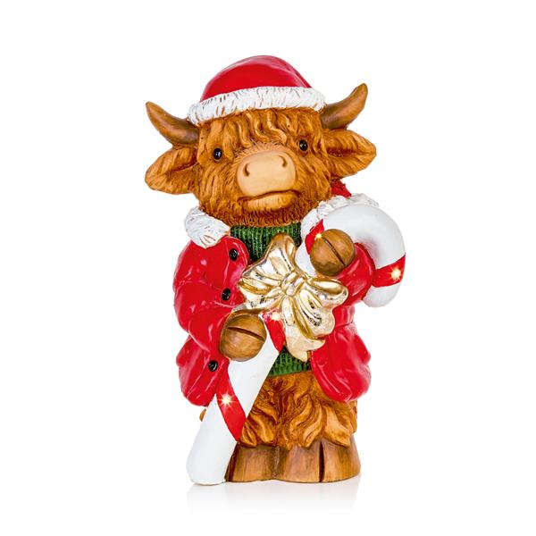 Resin highland cow figure holding candy cane. Illuminated by warm white LED lights.