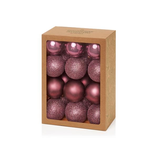 Pack of 24 boxed plum baubles in multiple finishes. Shatterproof.
